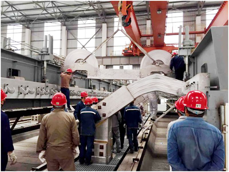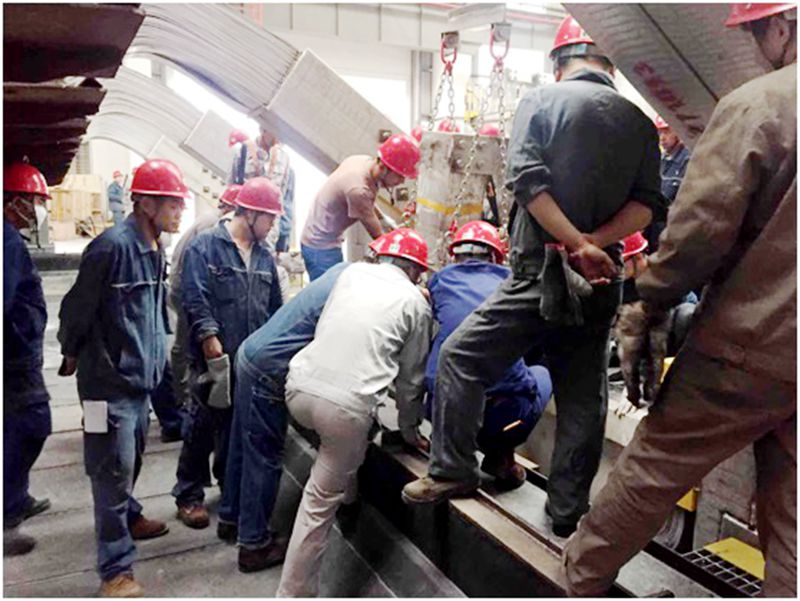 上午9時整,隨著分公司生產技術部副主任王立平同志一聲令下,現(xiàn)場實操演練正式開始。在生產廠家指導下,電解一車間、電解二車間、檢修車間積極行動,各負其責,通力配合。9時5分,工藝車隊托運進電端應急短路母線進入三通道,各車間人員按照指揮拆卸托運小車緊固螺栓,拆除301#槽3#、4#立柱母線風格網,天車配合吊裝短路母線就位,電解、檢修人員緊密配合,對工位、安裝卡具、緊固卡具螺栓。9時25分,進電端短路母線下部安裝完成。按照應急母線操作規(guī)程,9時40分,當進電端短路母線上部安裝完成時,整套進電端短路母線已全部安裝到位。