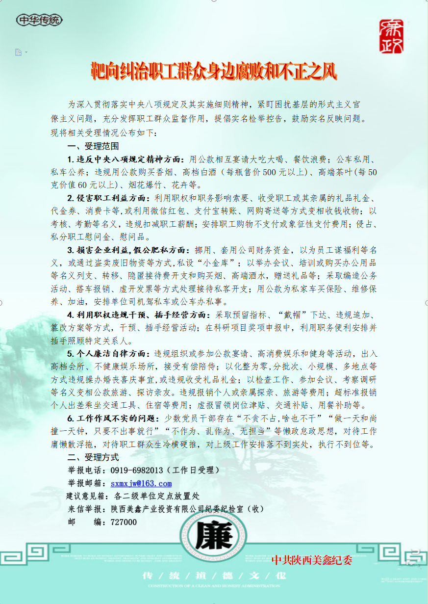 摘要: 為深入貫徹落實中央八項規(guī)定及其實施細則精神,緊盯困擾基層的形式主義官僚主義問題,充分發(fā)揮職工群眾監(jiān)督作用,提倡實名檢舉控告,鼓勵實名反映問題。公司紀委現(xiàn)將相關(guān)受理情況公布。