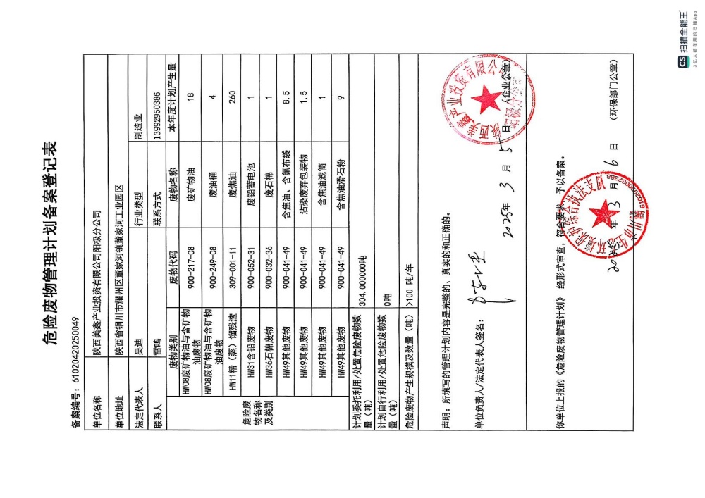 2025年危險廢物管理計劃(陽極分公司)